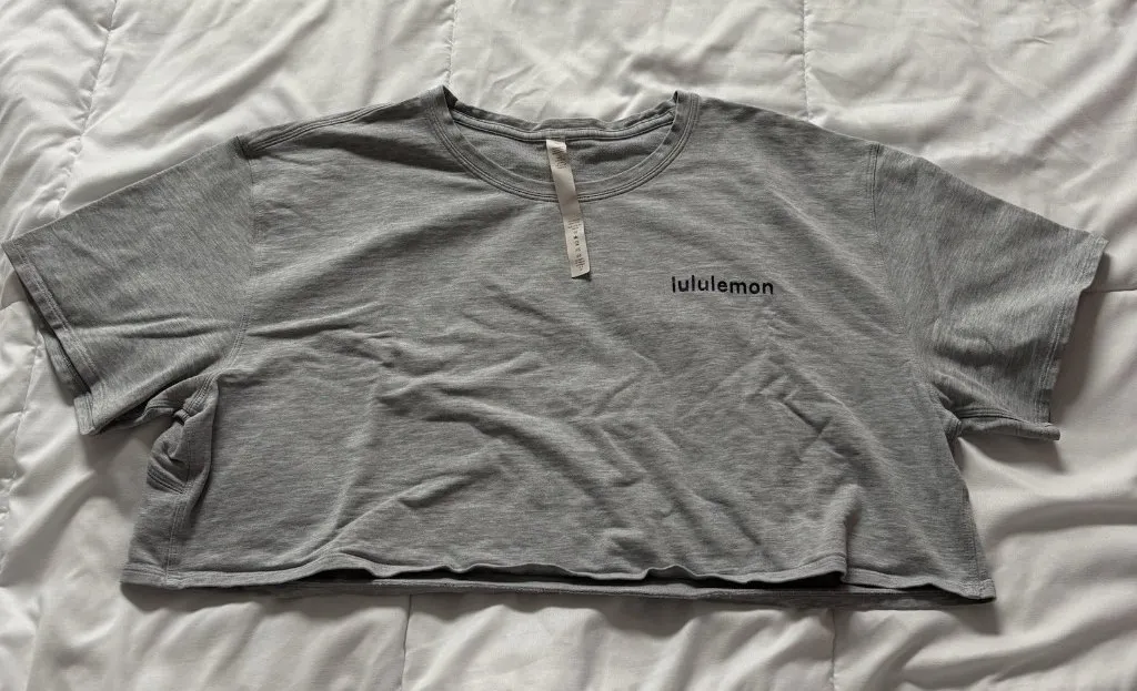 This Lululemon Women's Size 12 Short Sleeve cropped T-Shirt in gray is a versatile and comfortable addition to your wardrobe. Good preowned condition. Has cracking in the logo, small pinprick hole in the back. PLEASE see pictures! Tags: workout, activewear, training, gym, yoga, outdoor, walking, jogging, running
