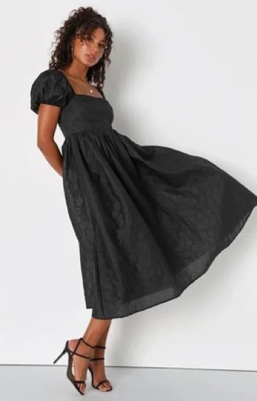 Lulus Adorable Mood Black Floral Jacquard Puff Sleeve Babydoll Midi Dress Can be worn on shoulder... Show more