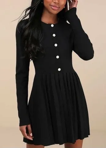 A Lulus black ribbed knit dress with a button front and pleated skirt. Designed with a classic crew... Show more