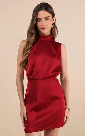 Feel like pure royalty for an evening in the Lulus Classic Elegance Wine Red Satin Sleeveless Mock Neck Mini Dress! Luxe stretch-woven satin shapes this gorgeous dress that has a mock neckline and a sleeveless bodice with gathered fabric detailing. An elasticized waist tops a flirty mini skirt complete with a side notch. Keyhole opening and double button closure at back. Hidden back zipper/clasp.