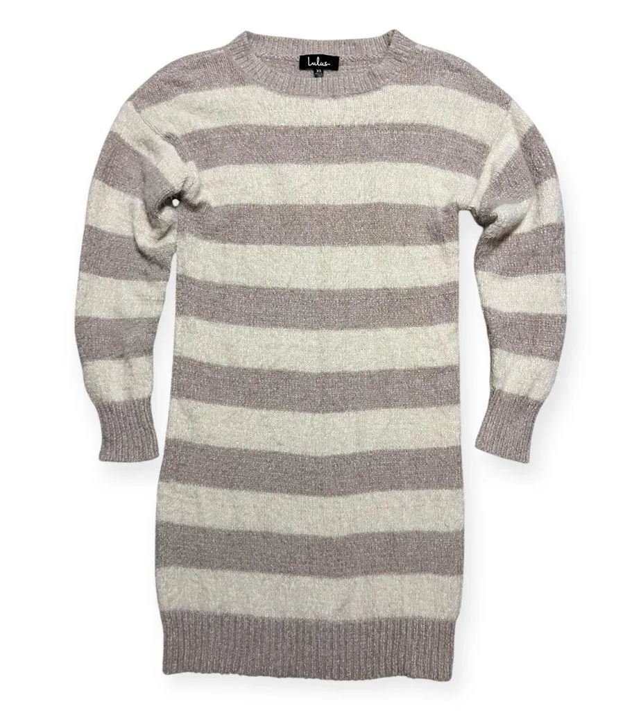 Stay comfy and chic with this Lulus striped sweater dress in size XS. Featuring soft taupe and beige horizontal stripes, this long sleeve knit dress is perfect for layering with boots and a jacket in fall or wearing casually with sneakers. • Brand: Lulus • Size: XS • Color: Taupe & Beige Stripes • Style: Sweater Dress / Longline Knit Tunic • Long Sleeves, Ribbed Cuffs & Hem • Cozy, Stretchy, and Warm ✨ Perfect for cozy casual days, coffee runs, or a dressed-up sweater weather look.