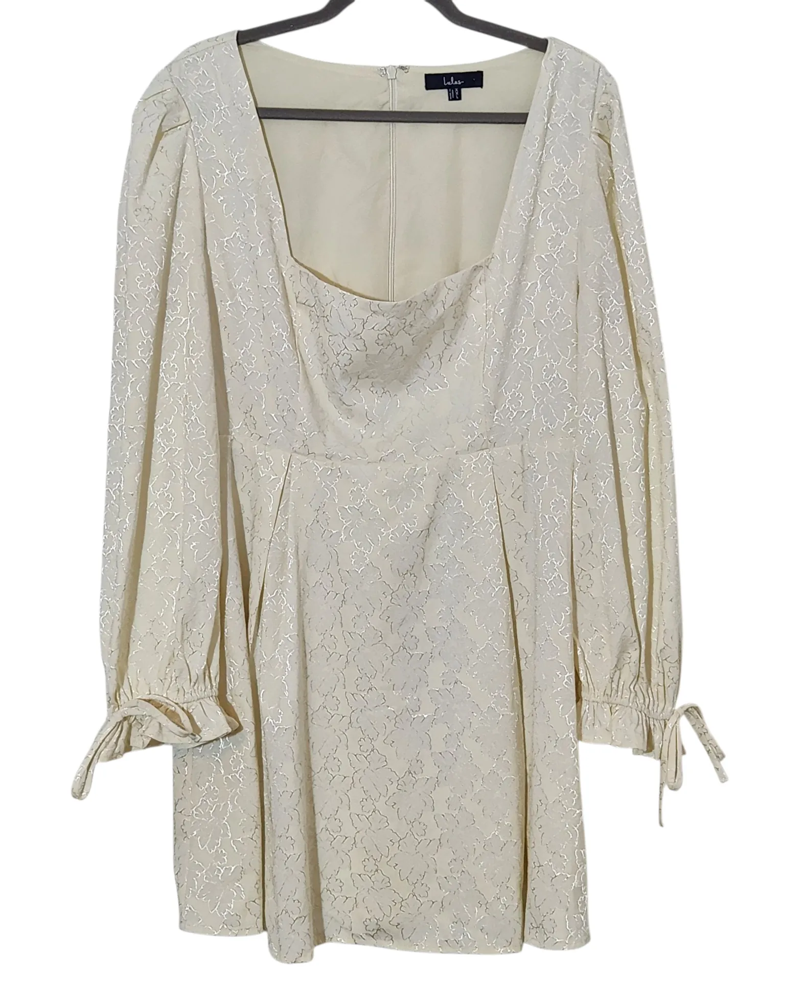 Lulus elegant cream jacquard print dress with tie detail at the end of the sleeves and a square neck... Show more