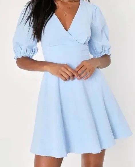 Keywords: Lulus dress, mini dress, blue dress, cotton dress, short sleeve dress, V neck dress, tie back dress, casual dress, party dress, fit and flare dress, summer dress, day dress, vacation dress, womens dress