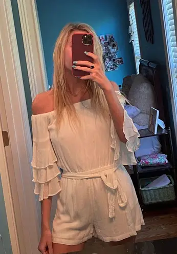 white lulus dress with ruffle sleeves and tie. off the shoulder. great condition. worn once.