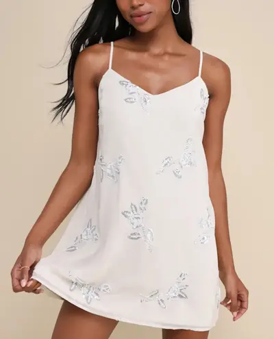 Lulus Elevated Approach Neutral Beaded Sequin Floral Shift Mini Dress Size Medium Approximate meas... Show more
