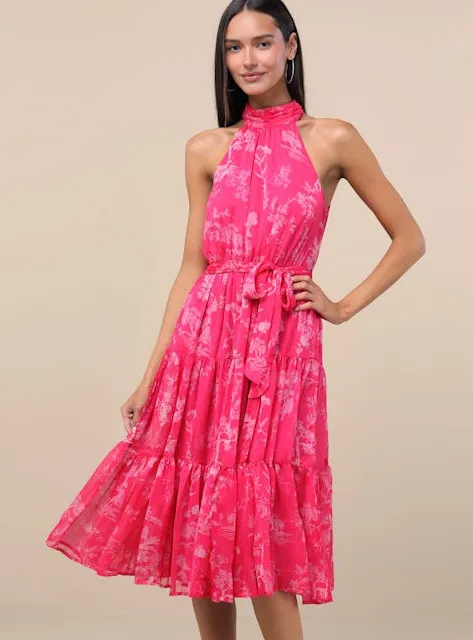 You'll be on cloud nine when you've got the Lulus Float to You Hot Pink Floral Print Halter-Neck Tie... Show more