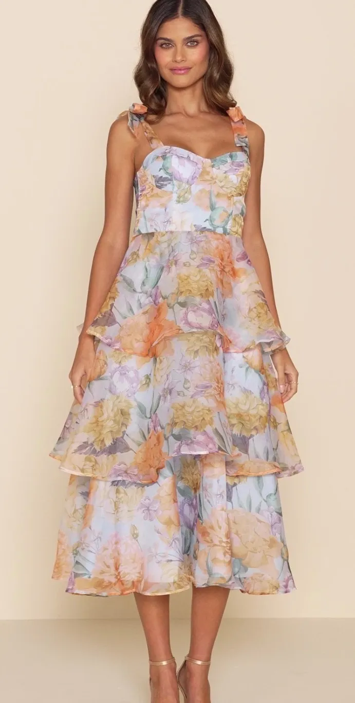 Keywords: floral dress, tiered dress, ruffle dress, tie shoulder dress, sweetheart neckline, midi dress, summer dress, vacation dress, garden party, romantic, feminine, boho, whimsical, lightweight