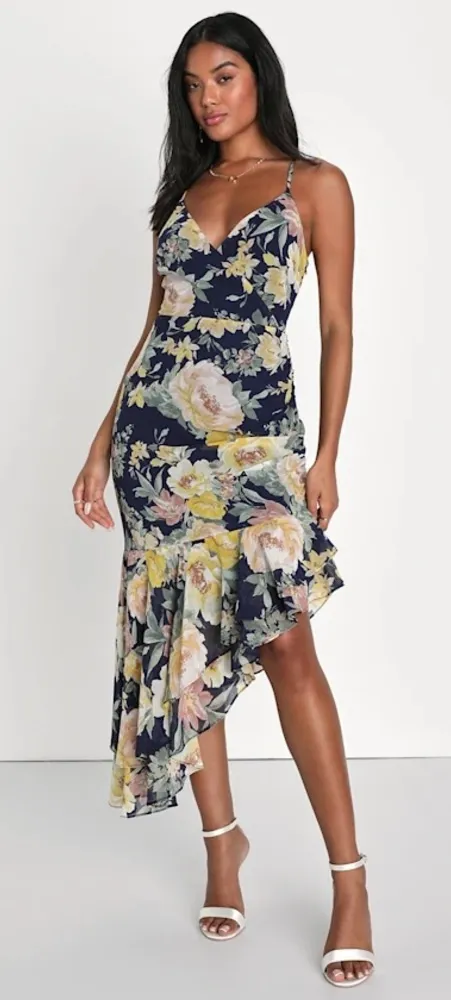 The Lulus Flowering Beauty Navy Blue Floral Print Asymmetrical Midi Dress in XL size is a stylish an... Show more