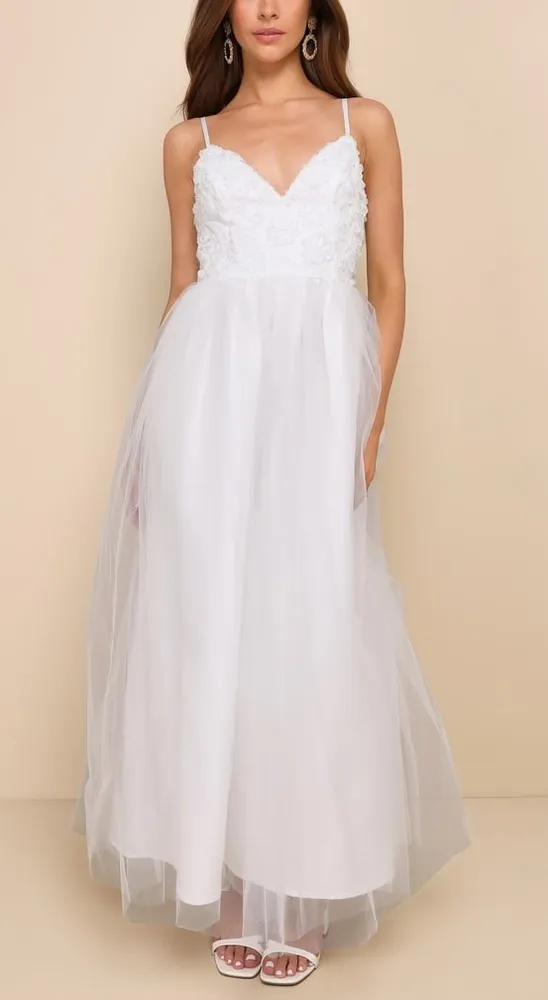 The Lulus Graceful Beauty White 3D Floral Tulle Sleeveless Maxi Dress is ready to make you look effortlessly charming for any daytime gala this season! Whimsical, three-dimensional floral appliques decorate a lace overlay that shapes a sleeveless, princess-seamed bodice and a plunging V-neck (and back), supported by adjustable spaghetti straps. The high, fitted waist tops a two-layered, skater-style tulle skirt that cascades down to an elegant maxi hem. Hidden back zipper/clasp.