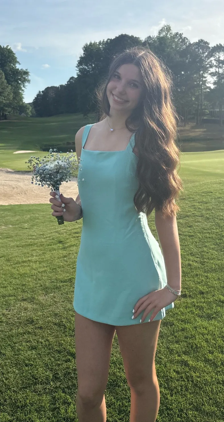 Size small teal colored homecoming dress with straps OG price of 60 Chayan Aqua Blue Sleeveless Sko... Show more