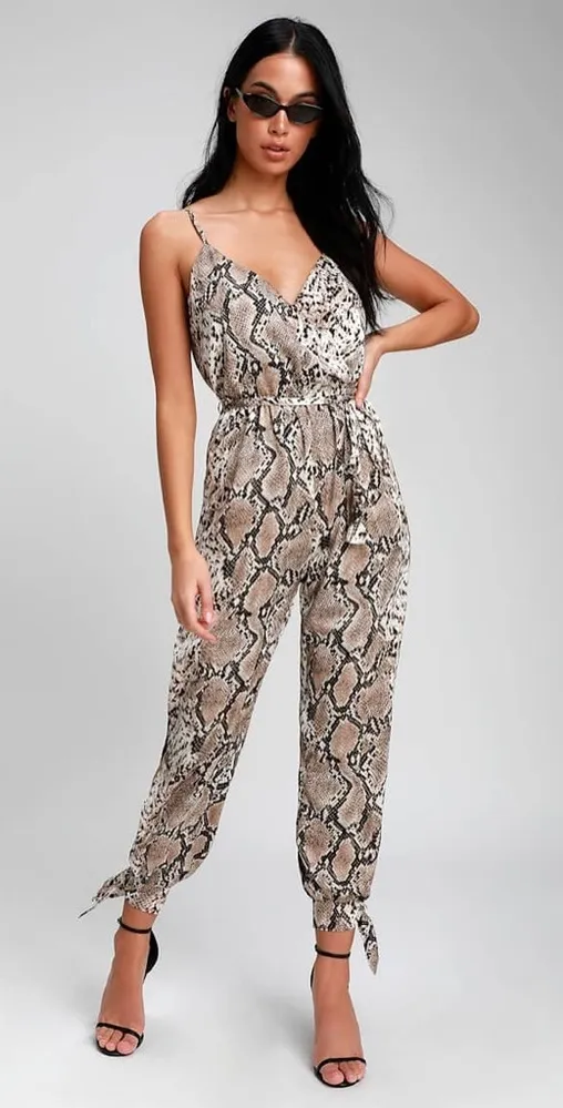 Make a sexy statement in the Lulus Jasper Beige Snake Print Surplice Jumpsuit! Soft and satiny woven... Show more