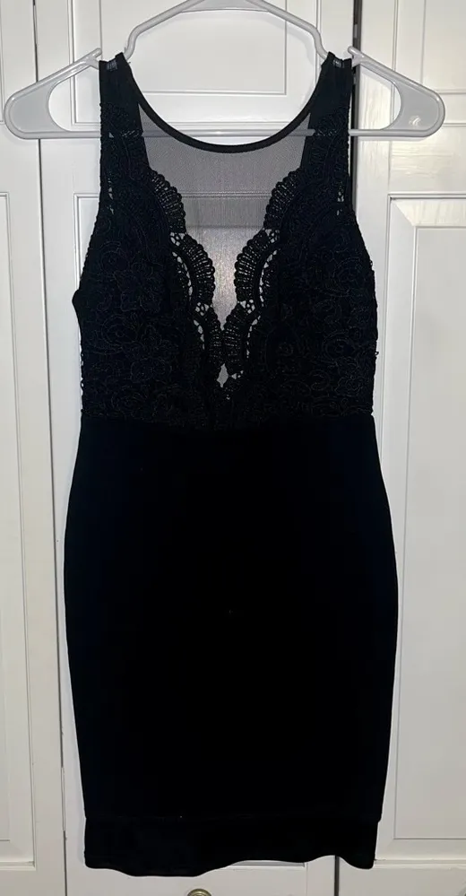 Chic black dress with intricate lace detailing. Perfect for evening events. No size in tag. Worn tw... Show more