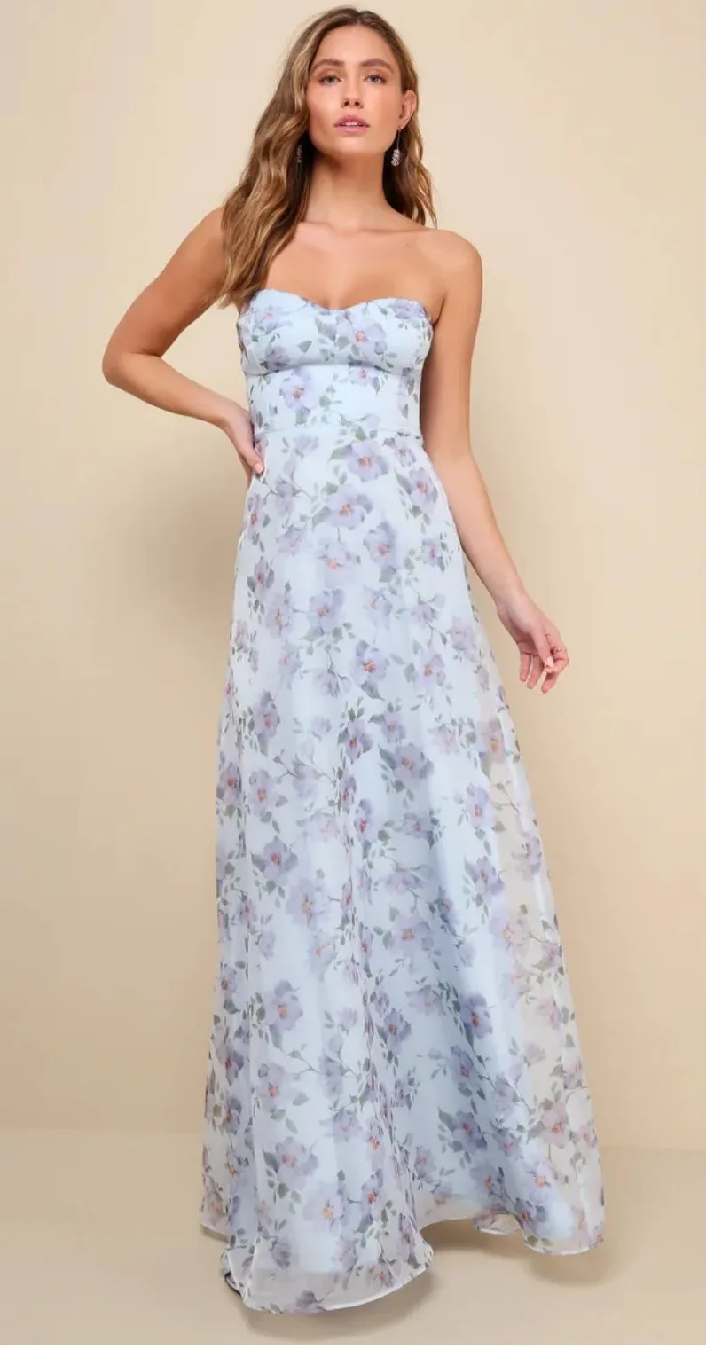 Excellent condition. Light blue, all over floral magnolia print. Structured organza, strapless sweet... Show more