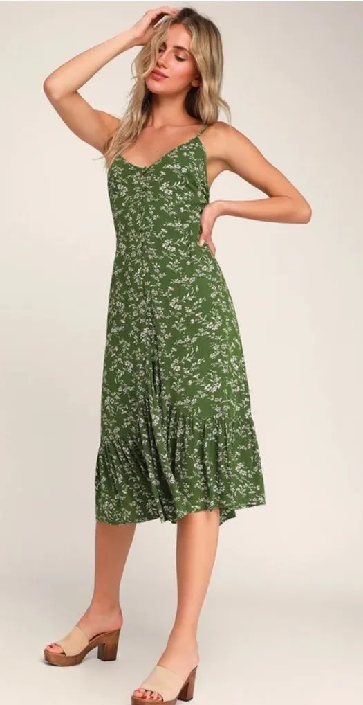 Lulus Missie Olive Green Floral Print Ruffled Tie-Back Midi Dress in size Small NWOT Excellent Cond... Show more