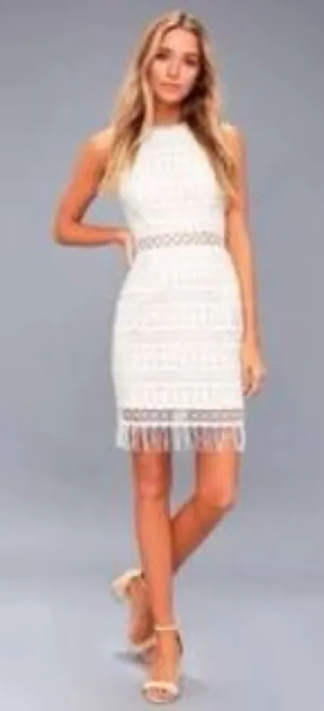White crochet lace overlaps a cream knit lining with a round neckline and darted sleeveless bodice w... Show more