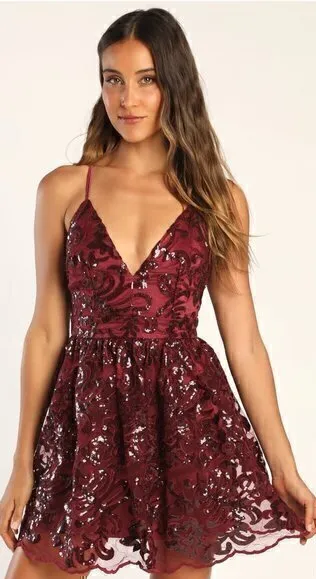 Lulu's Sweetest Celebrations Wine Red Sequin Skater Mini Dress; brand new in packaging Throw on the... Show more