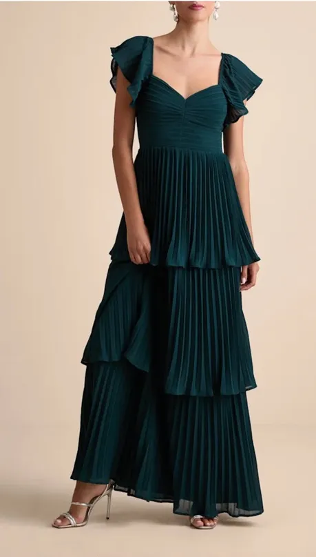 Chic teal maxi dress with pleated design. Features flutter sleeves and tiered skirt. Perfect for ele... Show more