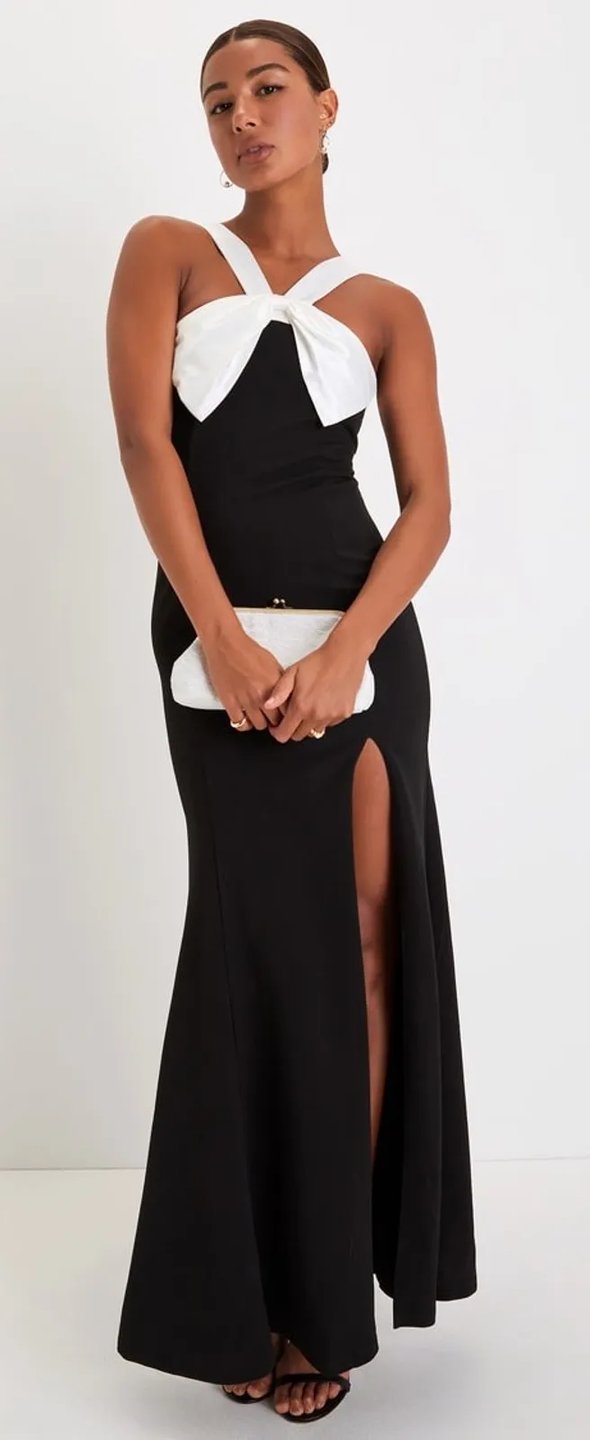 Arrive at your next event looking like a chic icon in the Lulus Luxurious Outlook Black and White Bow Mermaid Maxi Dress! This crepe knit dress falls from white satin tank straps into an apron neckline, with a dramatic bow detail, that tops a fitted bodice. The figure-skimming silhouette continues into a flattering mermaid maxi skirt with a thigh-high side slit. Hidden back zipper/clasp. Pair with your favorite jewelry and a cute clutch for a glam look!