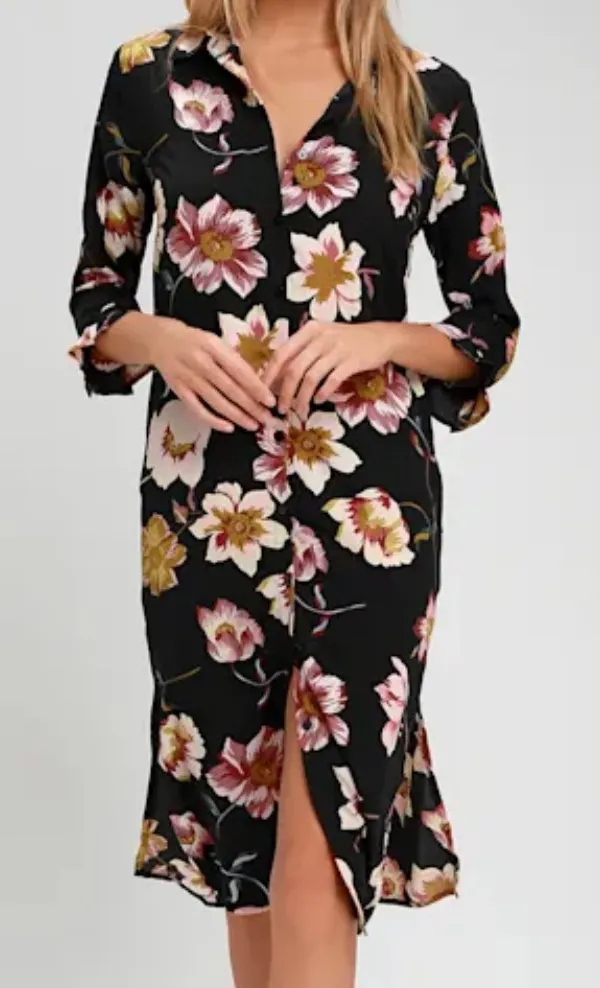 Chic black dress featuring vibrant floral accents. Ideal for stylish outings. Sleek woven fabric, in a mauve, beige, and dark mustard yellow floral print, shapes this chic shirt dress with a collared neckline and full button placket. Half sleeves with trendy flounce cuffs frame the relaxed bodice and midi-length shift skirt. Details 100% Polyester. Hand Wash Cold. Imported. Unlined. Style 694242 measures approximately 43.5" from shoulder to hem.