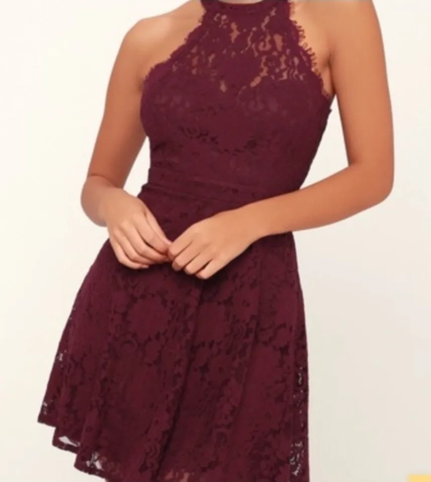 NWT Lulu’s Davina dress Size xs In Burgundy Floral lace overlay Sheer at top neck line High... Show more