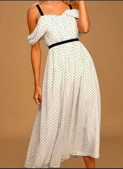 New with tag Size: L Color: White, Black Cold shoulder Adjustable straps Hidden back zipper closure Lined Approximate measurements laying flat; Pit to pit: 18” Waist: 15” Length: 50” Tags: polka dot midi romantic dance party cocktail event shower guest prom fit and flare wedding bride bridal photoshoot AC-1