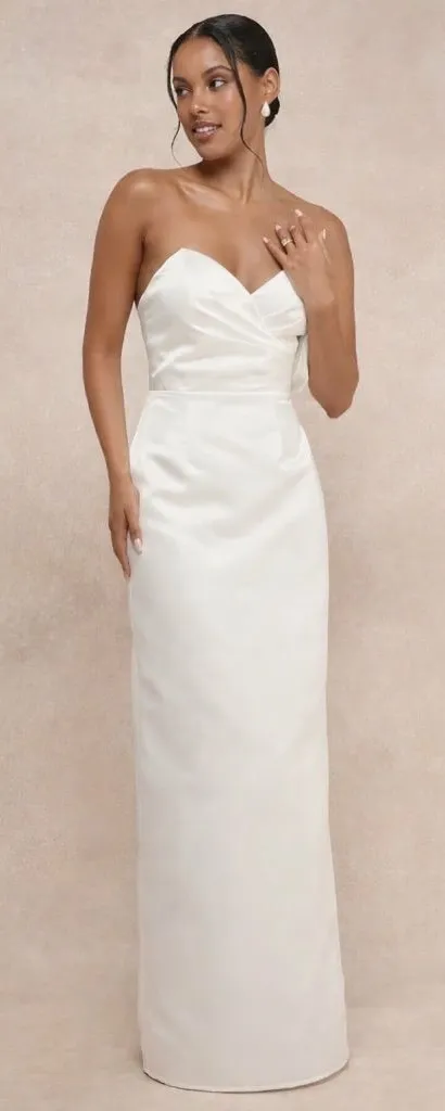 Ensure that your big day is truly unforgettable with a pristine look like the Lulus Profound Love White Satin Pleated Maxi Dress! Sleek woven satin lends a luxe essence to this gown that features a sweetheart-style neckline (with hidden no-slip strips) and a chic, pleated bodice with a surplice-inspired design, supportive padding, low-cut back, and side boning. The high, fitted waist tops a column skirt that falls to an elegant maxi hem with a flirty kick pleat at the back. Hidden back zipper/clasp.