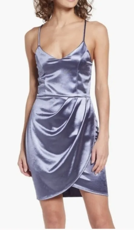 Excellent preowned condition. Purple satin sweetheart neckline spaghetti strap faux wrap mini dress.... Show more
