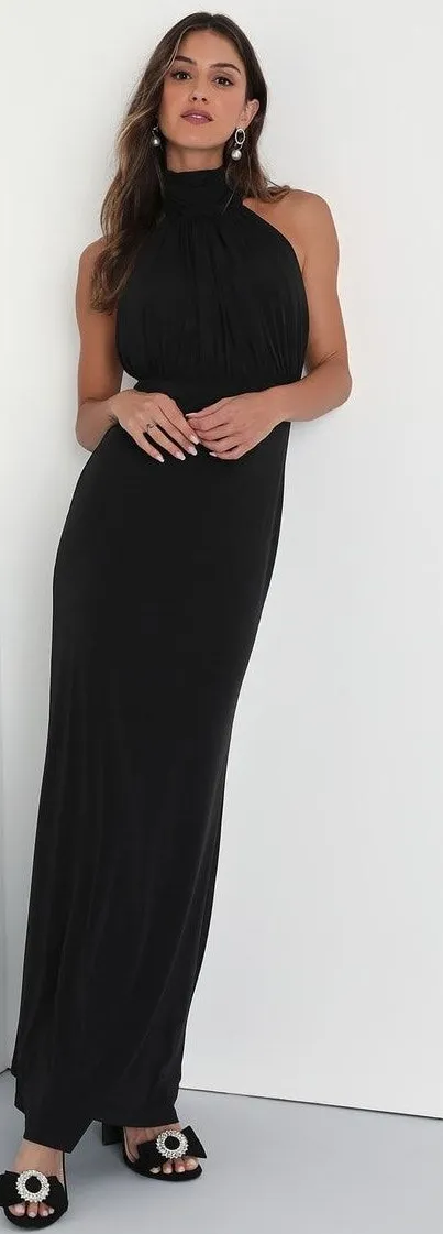 Classic glamour like the Lulus Romantic Chance Black Halter Backless Mermaid Maxi Dress will always impress! Slinky jersey knit fabric shapes this sultry dress that has a modified halter neckline with loop button closures. Bodice boasts a gathered design and a stunning open back that's sure to have all eyes on you! Skirt falls in a mermaid silhouette, finishing at a maxi hem. Hidden zipper/clasp at back.