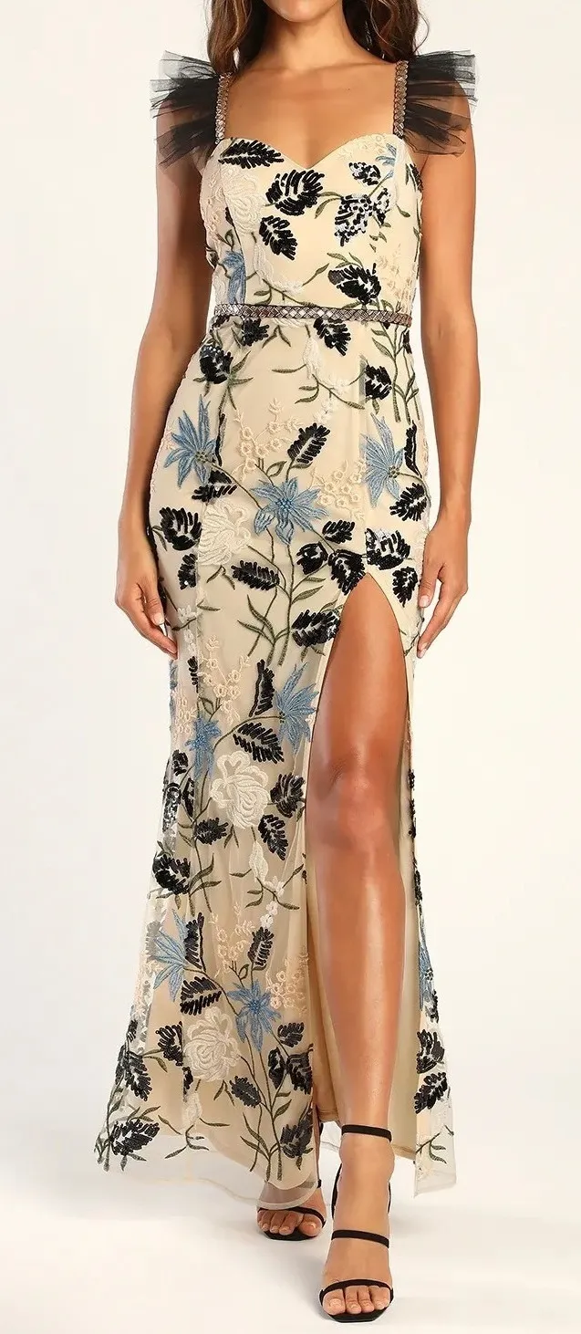 Lulus Show Stopper Cream Embroidered Sequin Bodycon Maxi Dress Tulle Gown Size: XS Approximate meas... Show more