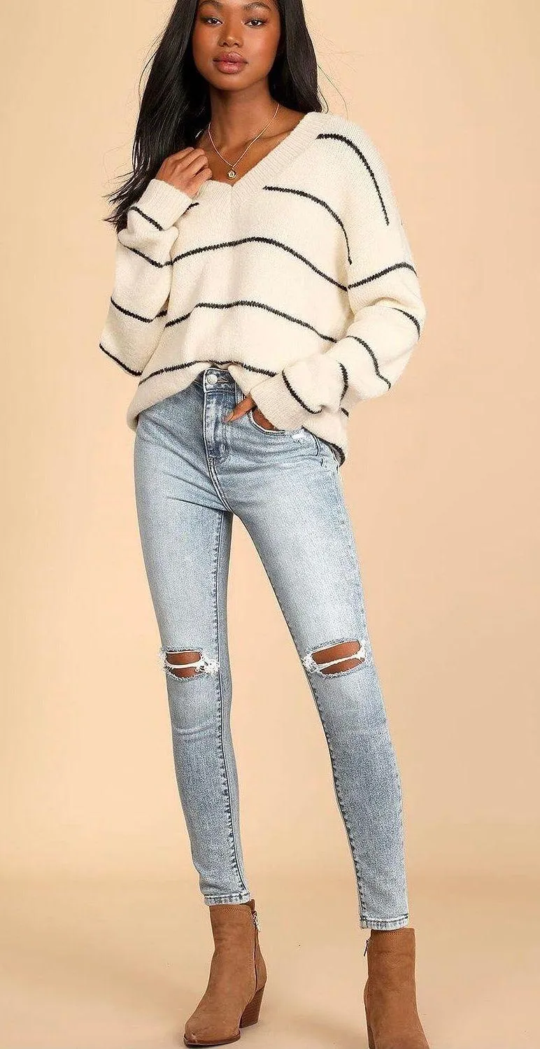Light Wash Denim Distressed High Rise Skinny Jeans! Light wash stretchy denim (in Daze Denim's Infat... Show more