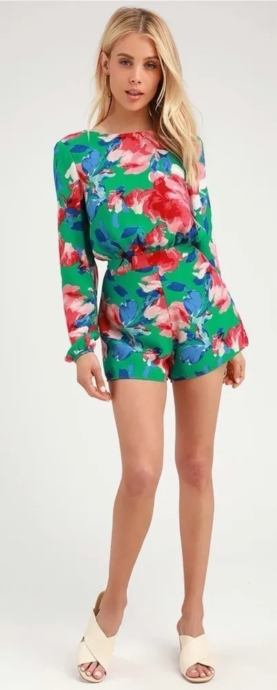 Lulus Sweetest Song Floral Print Backless Long Sleeve Romper in Green Size Medium Excellent Used... Show more