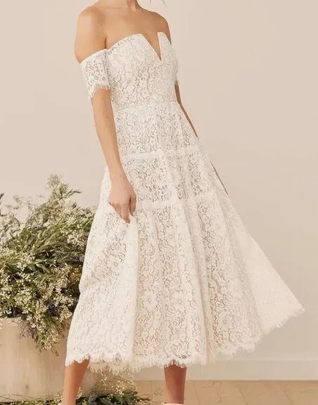 Lulu’s _ White Floral Lace Midi Dress _ Off Shoulder Lace Sleeves _ Nude Underlay Length: 36” Bust... Show more