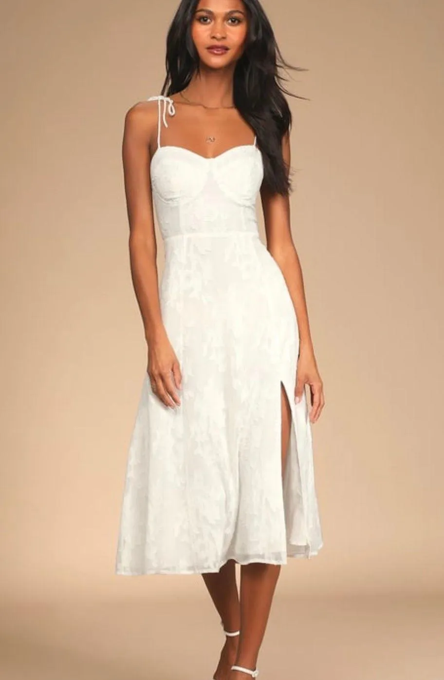 Beautiful white midi dress with a sweetheart neckline and tie-straps for the perfect fit. Won one f... Show more