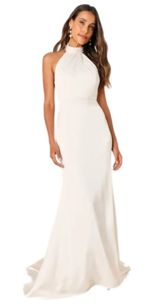 Lulus Eternity Together White Satin Halter Mermaid Maxi Dress. This elegant wedding dress features p... Show more