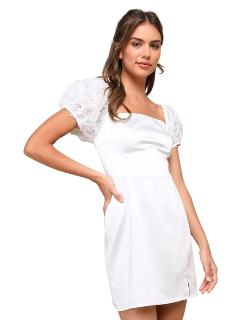 Lulus Precious Enchantment White Satin Floral Puff Sleeve Mini Dress. Features satin fabric, small s... Show more