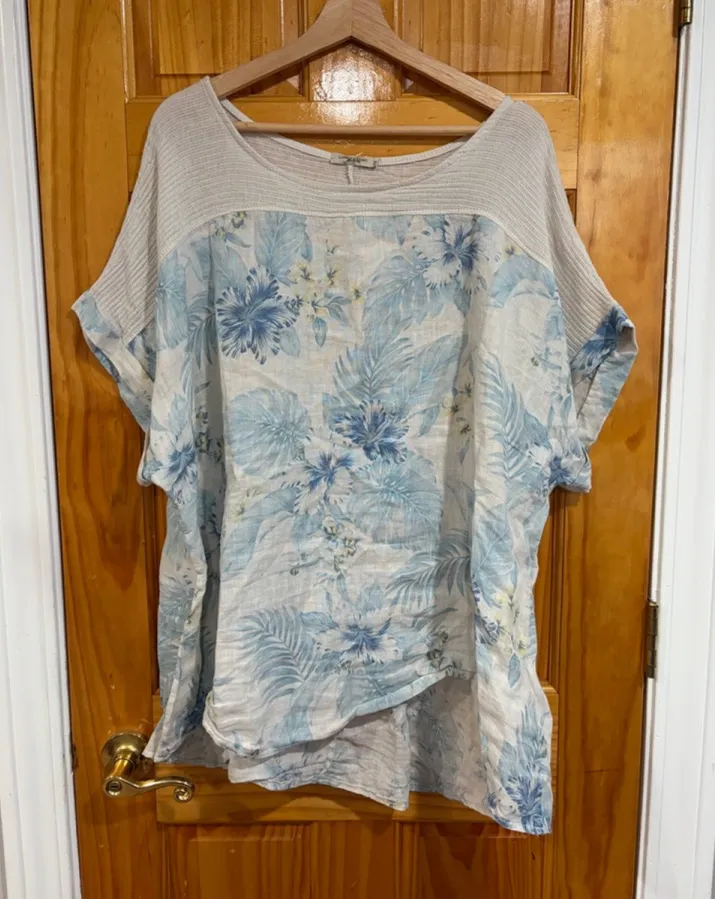 Lungo L’Arno Made in Italy women’s 3X oversized linen/cotton blend floral top. Light, airy, and comfortable with a mixed-knit upper panel and loose-fit silhouette. Perfect for boho, resort, vacation, or everyday casual wear. Details: Women’s 3X Made in Italy 100% linen front / 100% cotton knit upper Blue floral print Oversized, relaxed fit Lightweight, breathable Condition: Minor general wear, no major flaws