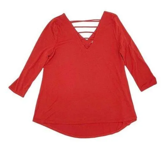LUQ Women's 3/4 Sleeve Blouse V-neck with criss-cross detailing on front and back High low hem Rust orange-red color - perfect color for fall/autumn Great business casual, career wear staple piece Stitch Fix brand Size Small Style J70558CCBLP Very good pre-owned condition with no flaws Approximate measurements laying flat: Pit to pit: 18" Length: 24" in front, 26" in back