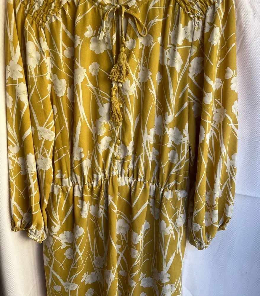 Chic mustard dress featuring a floral pattern. Elegant tassels add a stylish touch.