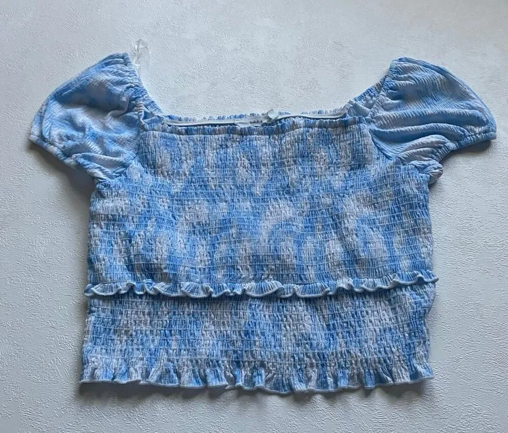 Adorable LUSH smocked crop top in a soft blue and white pattern. Features puff sleeves, stretchy smo... Show more
