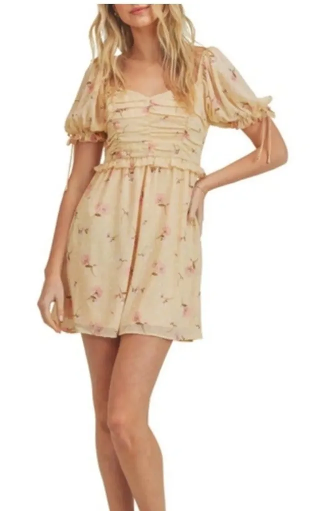 Charming cream dress with floral pattern. Features puff sleeves and ruched bodice. Perfect for casua... Show more