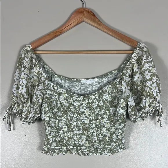 Off-shoulder Puff sleeves Smocked bodice Cropped length Floral print Elastic neckline Short sleeves... Show more