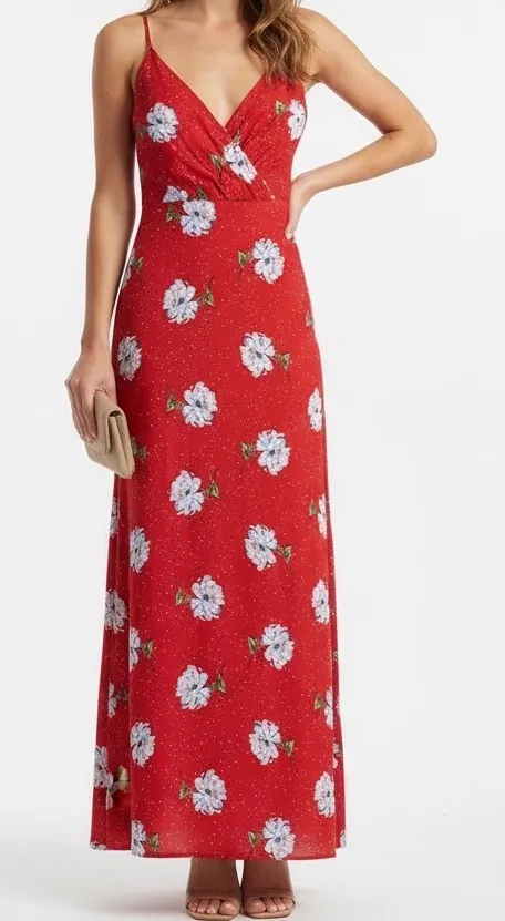Keywords: Lush, women dress, maxi dress, red floral, surplice neck, sleeveless, chic, boho, summer, casual, comfortable, flowy
