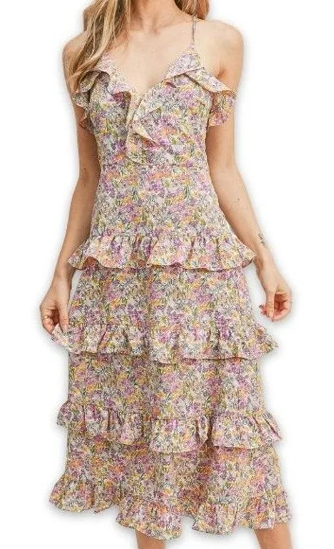 This stunning sundress features a vibrant lavender and yellow floral print, designed with ruffles fo... Show more