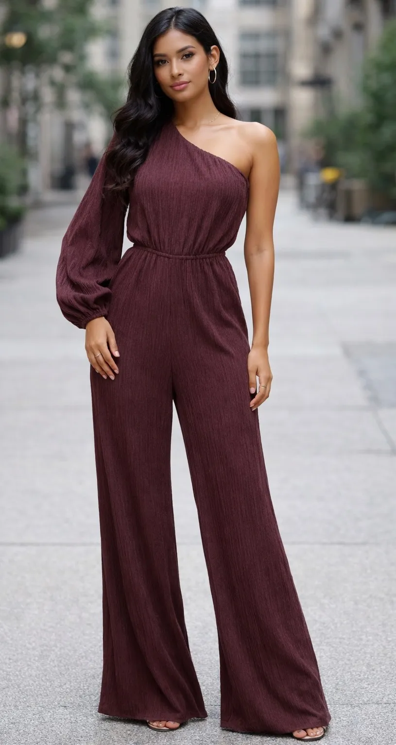 Elegant Lush jumpsuit with a one-shoulder neckline and dramatic long sleeve. Features an elastic wai... Show more