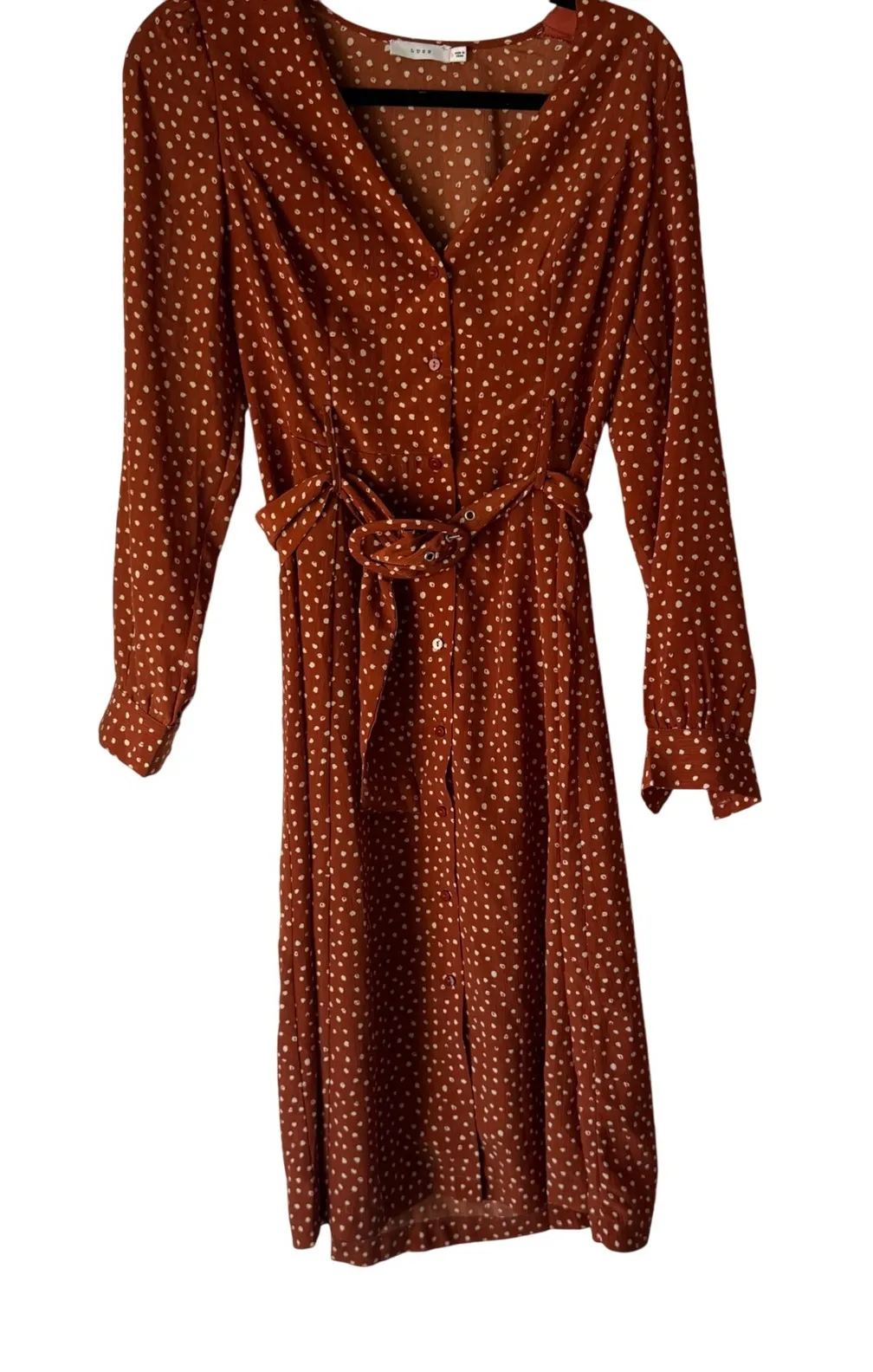 Lush Small Rust Brown Polka Dot Long Sleeve Midi Dress with Belt Preppy Old Money Style: Shirt Dres... Show more