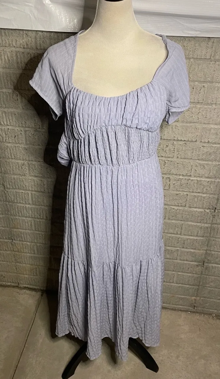 Embrace effortless charm with this stunning NWT Lush purple maxi dress. Featuring a stylish smocked bodice, a flattering square neckline, and playful tiered skirt, it's perfect for warm-weather adventures. Its peasant-inspired design and comfortable, textured fabric make it an essential addition to your wardrobe for both casual outings and special occasions.