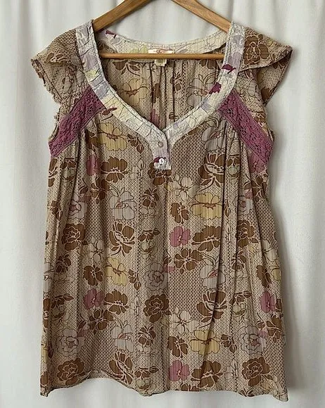 Lux Cute Boho Brown/Purple Floral Lace Cap Sleeve Shirt Top **Size L** 🌸🌸 Size L - $29 - From Kims