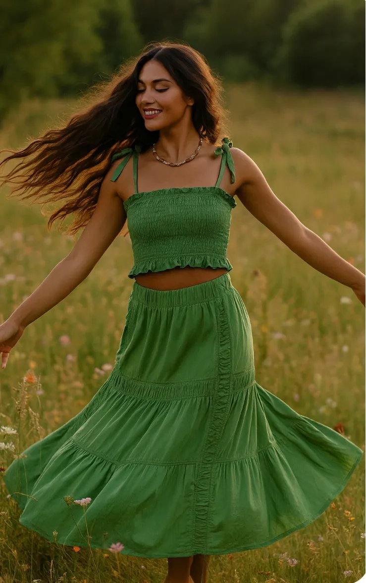 La Chocole Brazilian Designer 2 Piece Green Maxi Dress /Smocked top with square neck and tie straps Ruffles tiered maxi skirt Boho, forest fairycore, granola girl, resort, travel, garden party, brunch, beach wedding, festival, hippie Med