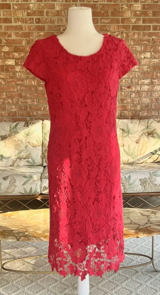Luxology Dress Lace Crochet Midi Cap Sleeve Sheath 10 ~ well made medium weight fabric ~ lined ~ back zipper with hook and eye ~ round neck ~ hits slightly below the knee depending on height ~ excellent condition Size: 41” Pit to pit: 19.5” Bright dinner festive holiday Christmas New Year’s Eve Fun floral lace, classic style , cocktail dress, fitted dress, red lace dress, date night look, timeless fashion , special event , semi-formal