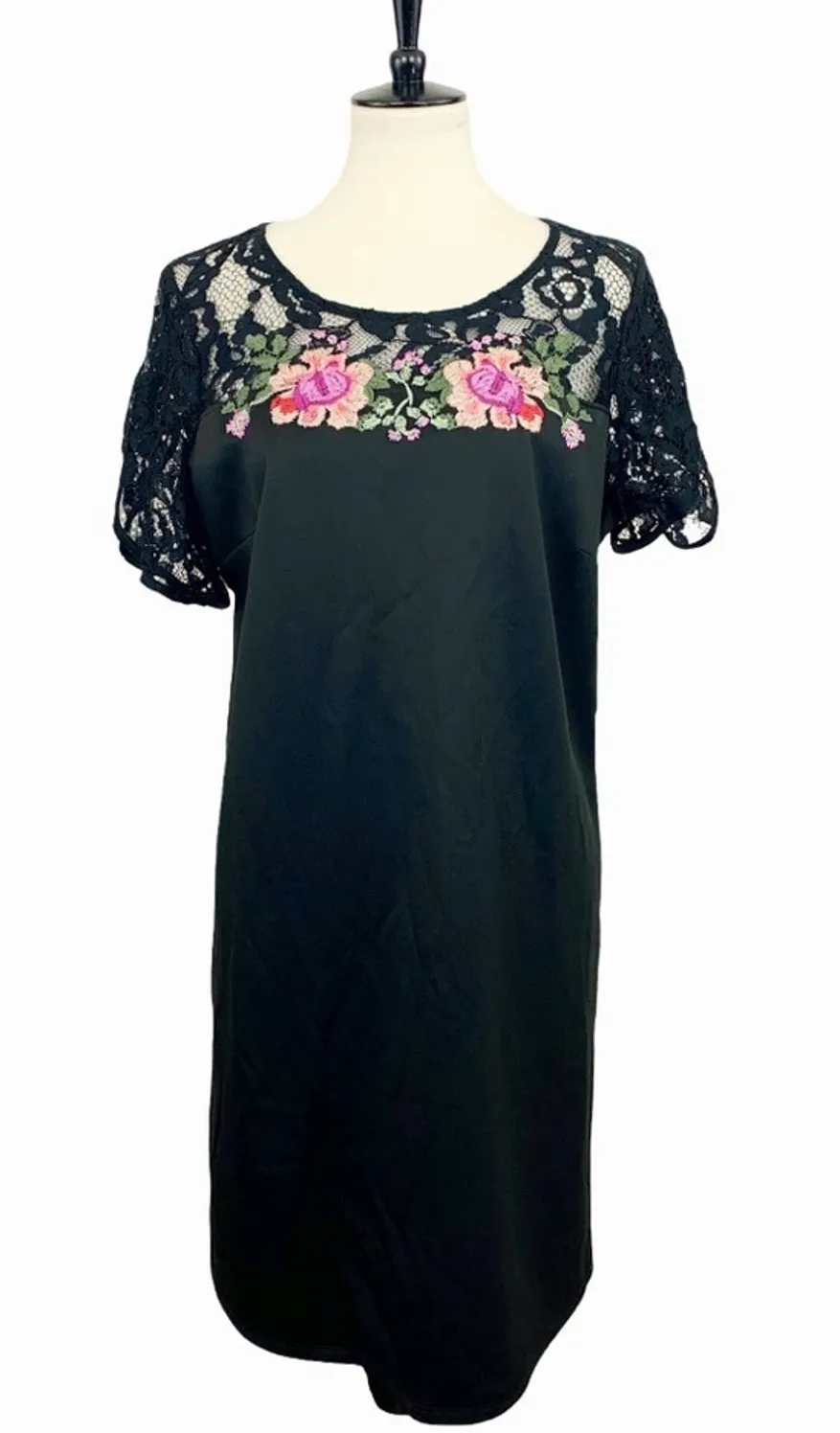 Luxology • Black Pink Floral Embroidered Dress • L Style Details • Short sleeves, scoop neck • Pul... Show more